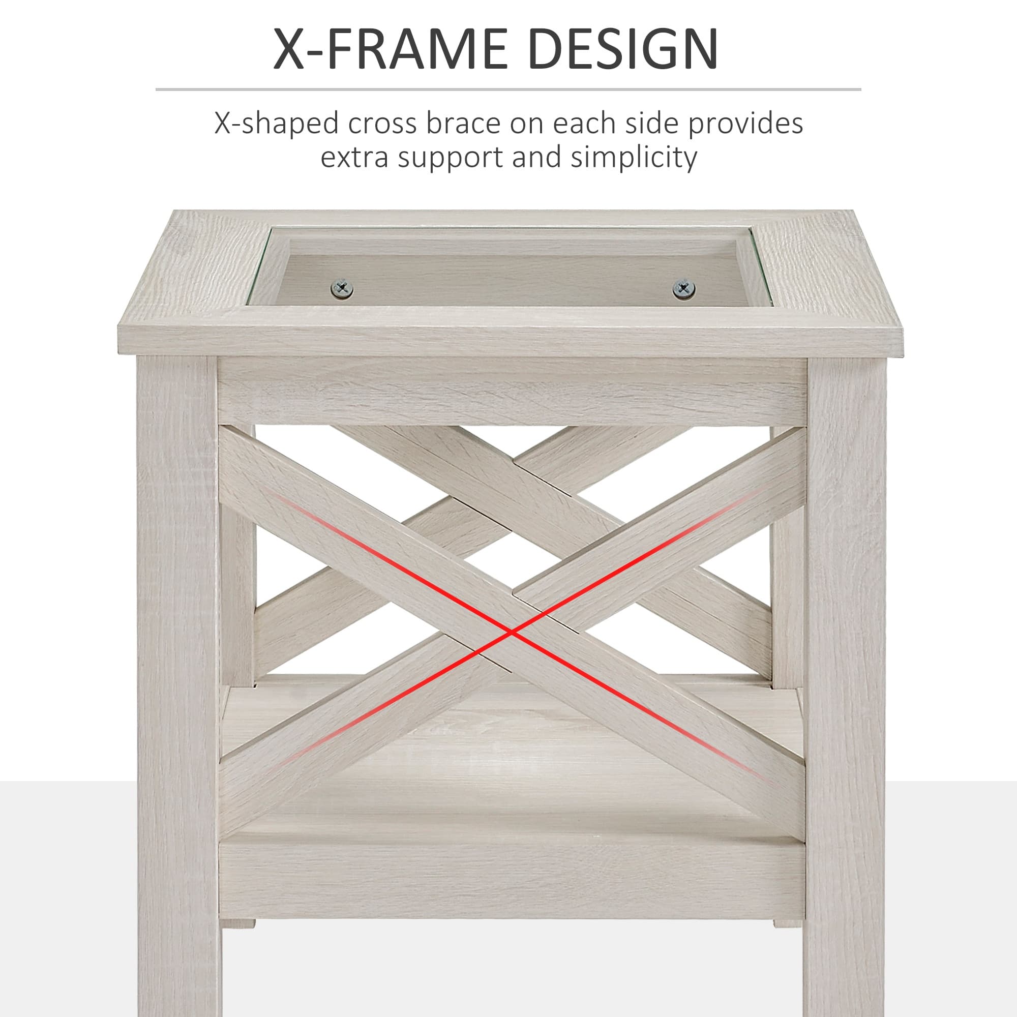 Enhance your living room, bedroom, or dining area with this HOMCOM end table. Constructed from high-quality MDF board and thick sturdy legs, its X-shaped reinforced structure provides long-lasting stability. The tempered glass top is both attractive and simple to clean. A bottom shelf offers extra storage space, helping to keep your room organized. Opt for this table to keep your home tidy and clean.
