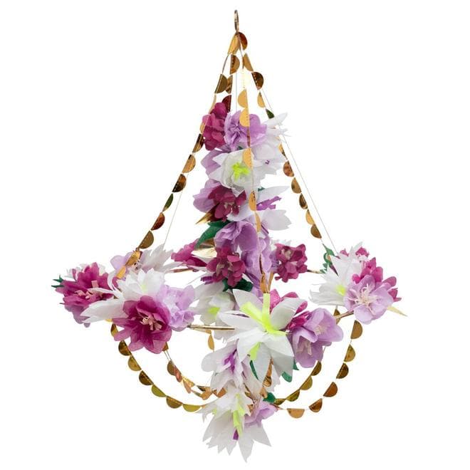 The gorgeous combination of pastel and bright flowers ,with gold foil detail, on this Pajaki inspired chandelier will beautifully transform a room. It is perfect for a springtime party or whenever you want to add instant color and style. This Polish pajaki inspired hanging decoration will brighten up any room It is crafted with neon and pastel tissue paper flowers It has gold foil scallop shaped detail for a stylish and shimmering effect Product dimensions: 17 x 22 inches Pack dimensions: 16 x 16 x 4 inches