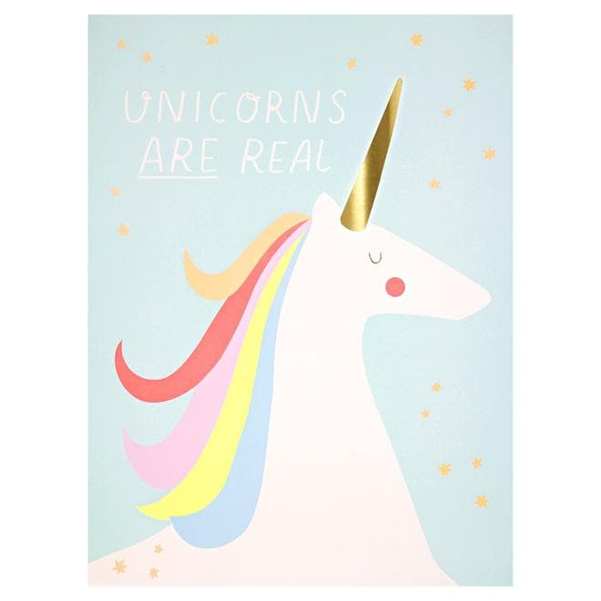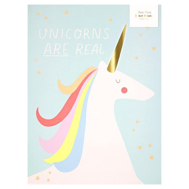 Add a touch of wonder to any little one's bedroom with this pair of art prints. Featuring a sweet unicorn and a cheerful rainbow in bright colors with gold foil detail. Mount these prints in a free-standing frame or hang them on a wall