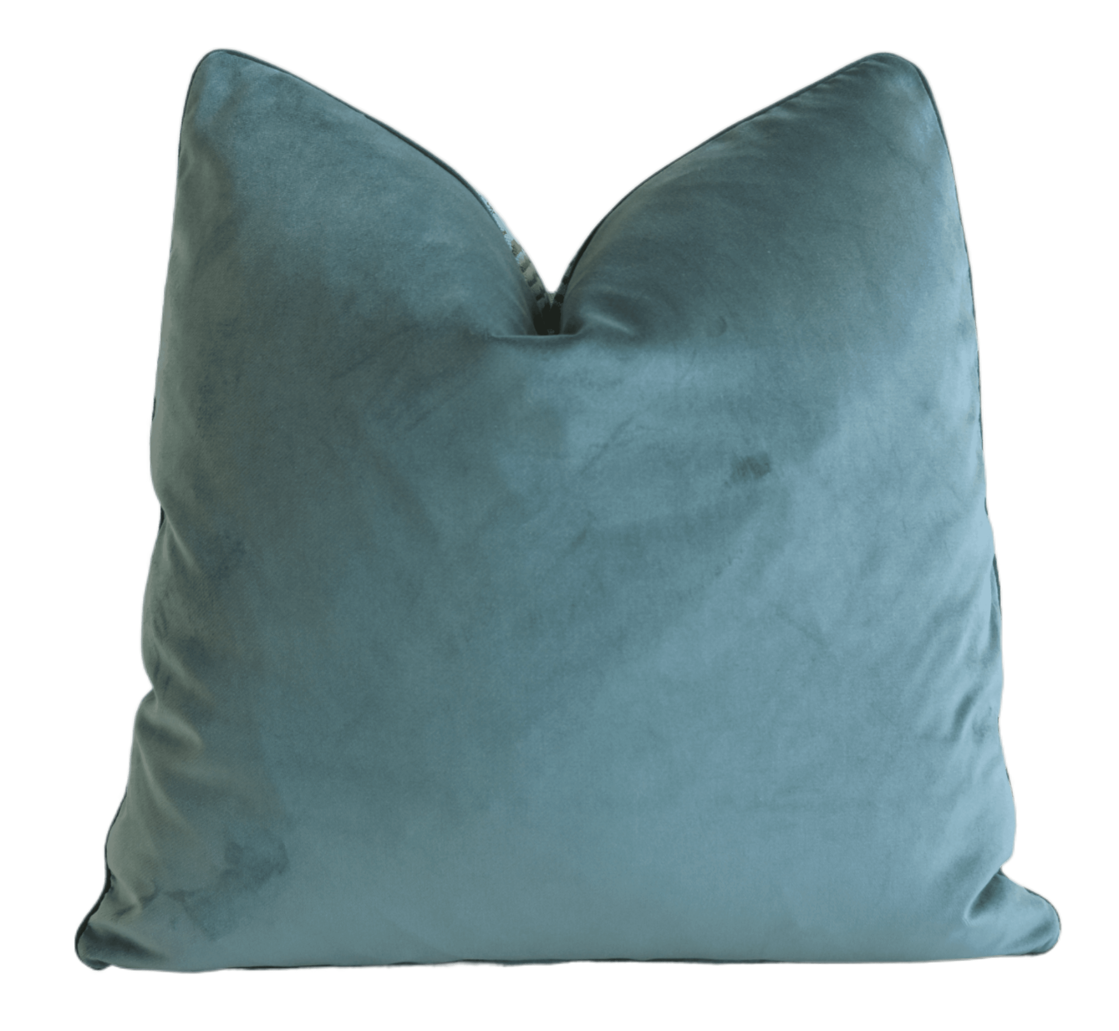 Custom-made pillow featuring Perennials Fabrics 'Bazaar Green Parrot' cotton-blend material showcasing a vibrant pattern. Backed with blue-teal cotton velvet. Comes with custom cord trim and zipper closure. Includes a fluffy new goose feather-down insert. In pristine, unused condition.