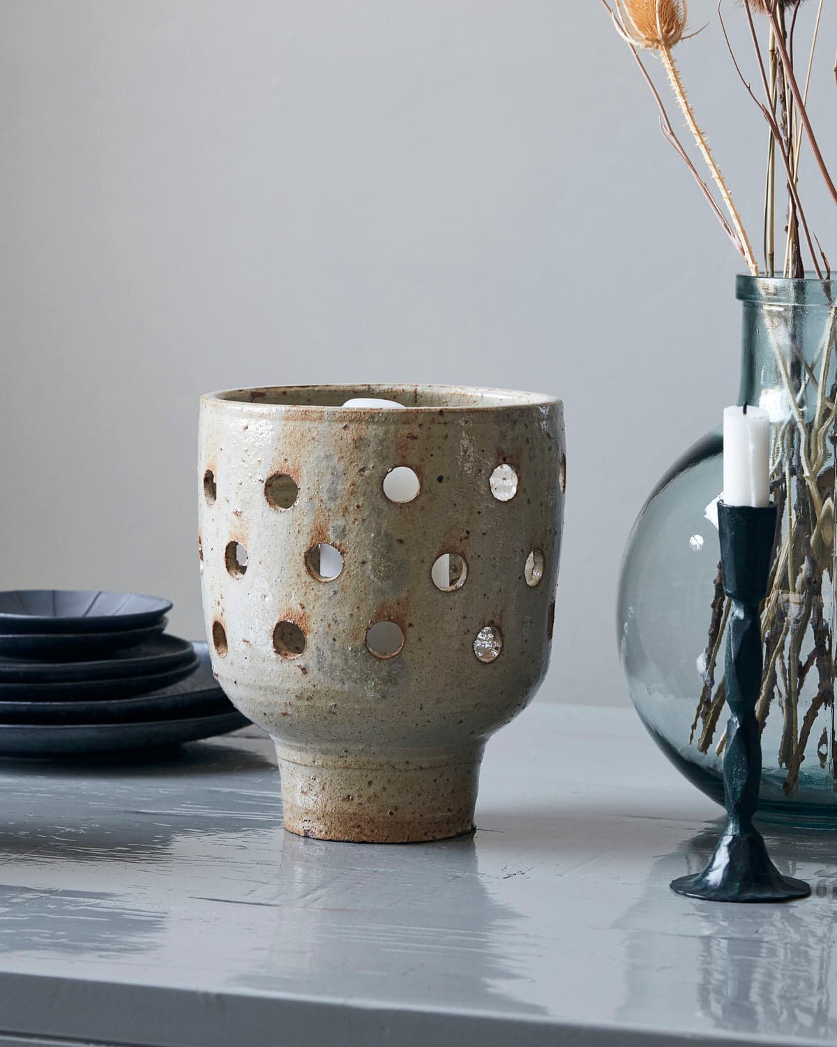 Artist is the ideal tealight holder to create the right atmosphere on those long autumn evenings. The overall expression is simplistic but with functional and decorative details. To let the light shine through, holes have been made in the stoneware which has been given a beige, rustic glaze. They are not perfectly round and the glaze is imperfect on purpose. This all adds character and charm to the overall design of this tealight holder from House Doctor. Pair Artist with the smaller version or with other candle holders in various materials to create a unique display. Color: Beige Dimensions: h: 26 cm/10 in, dia: 20 cm/7.8 in *Images shown are for Illustration purpose only, actual product's color/finish/option may vary.