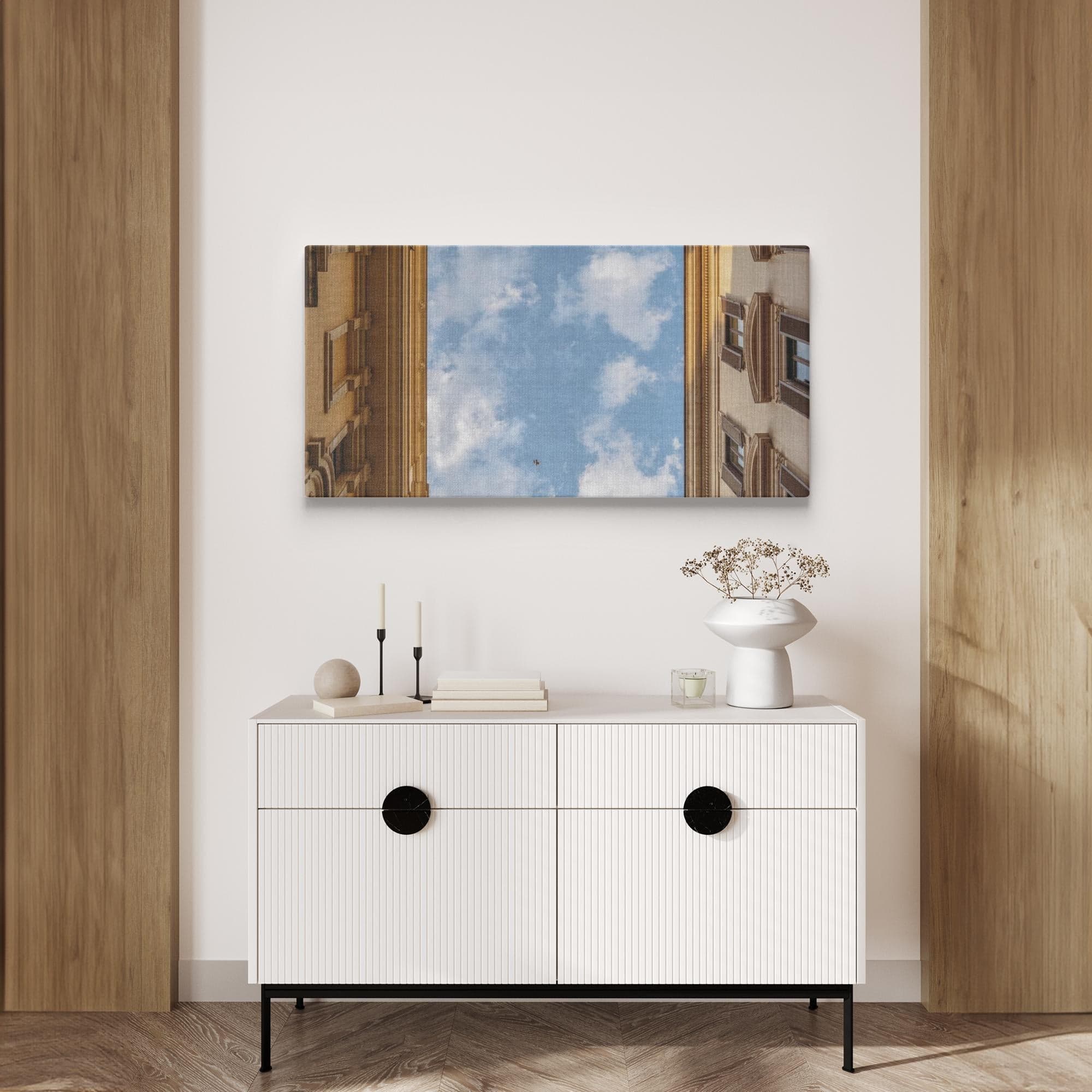 The view from the ground, a beautiful slice of the Italian sky framed by classic, Italian architecture on a perfect day. Printed on high quality, artist grade stock and folded around a lightweight frame to give them a gorgeous, gallery ready appearance. With acid free ink that will last without fading or chipping, Features a scratch-resistant UV coating. Wipes clean easily with a damp cloth or to remove dust, vacuum gently using a soft brush attachment.