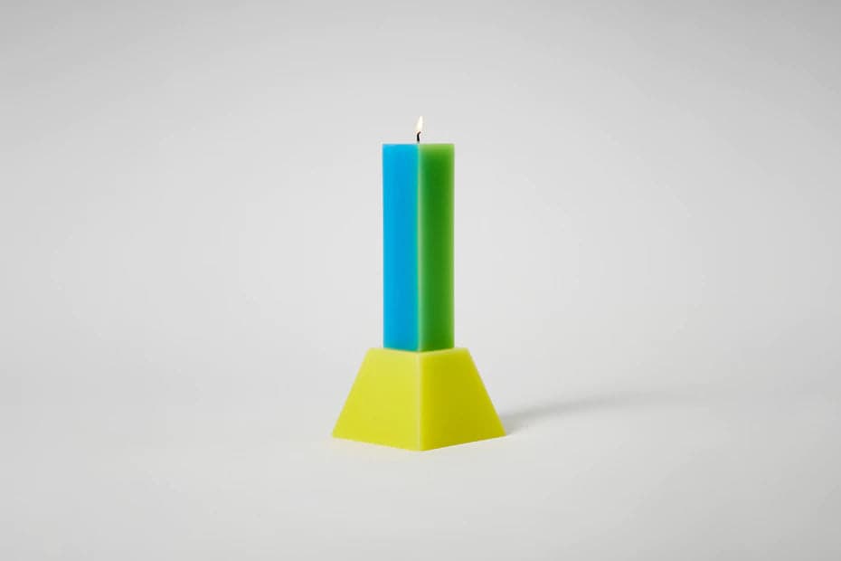 This candle is adapted from designer Yinka Ilori's chair series, Types of Happiness. Each chair in the series tells a story of the sixteen different types of happiness. These stories continue through the pillar candles by replicating the colors used on the chair legs, each of which evoke a type of happy feeling. Product Overview Color: Blue/Green Materials: Paraffin Wax Dimensions: 4" x 4" x 9" Care Instructions: Do not leave burning candle unattended. Burn time for Happiness 1 Candle is approximately 55 hours, and burn time for Happiness 2 Candle is approximately 45 hours.