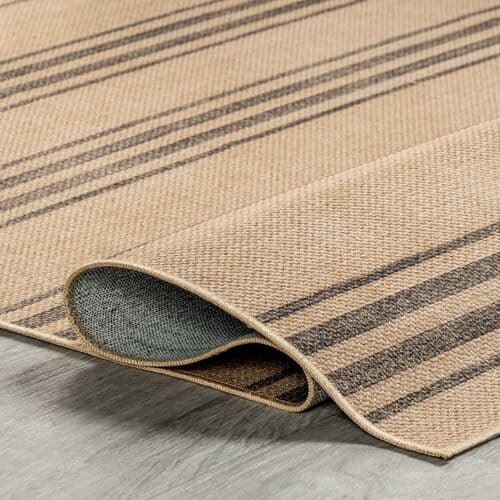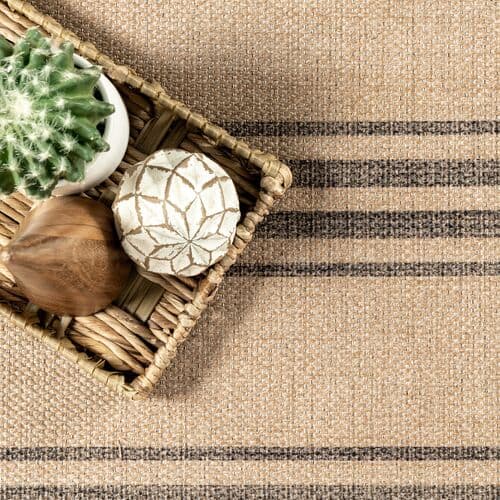 This striped rug, made from recycled fibers, is GRS certified and machine washable. Though it resembles jute, it is more durable. Recommended to use with a rug pad to reduce slipping.