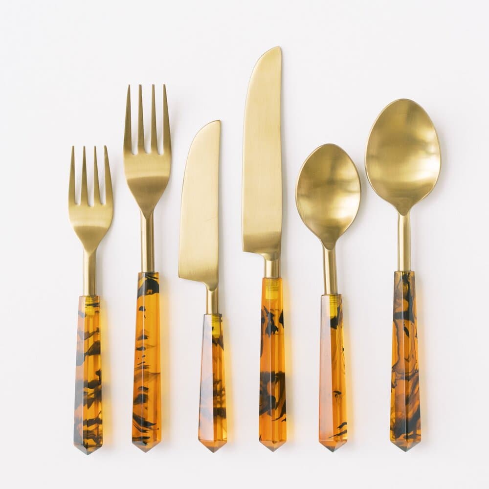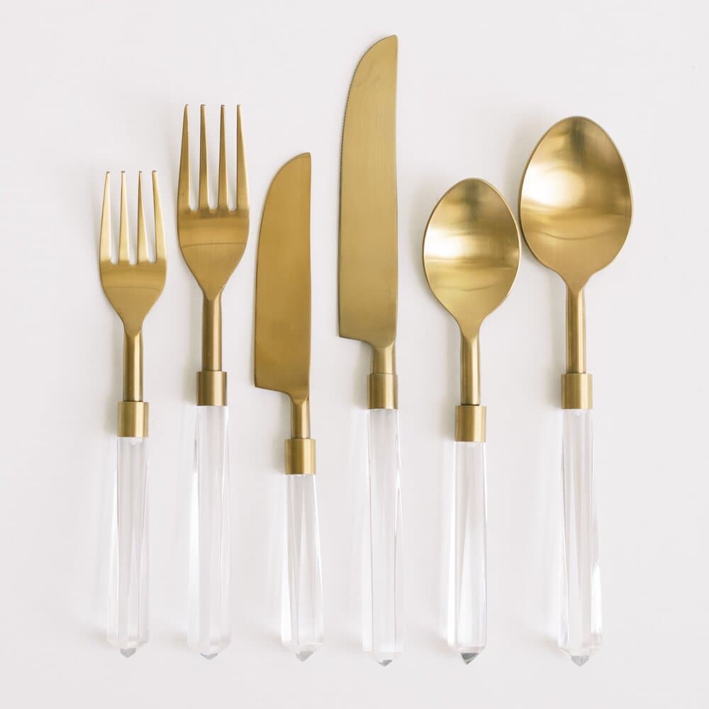 The PRISM Collection was designed to be sleek, contemporary, and geometric. With a slender handle and unique color variations, this flatware is 24K Brushed Gold with a lucite handle. A 6 piece single setting for your classic formal setup includes: 1 Salad/Dessert Fork 1 Dinner Fork 1 Butter Knife 1 Dinner Knife 1 Teaspoon 1 Dinner Spoon Product Care Stainless steel + acrylic is NOT dishwasher safe but is easy to maintain with hand washing methods. Lemon detergent is not recommended as this may cause corrosion. NOT Dishwasher safe. The ideal method for washing flatware is by hand. For best results do not leave flatware soaking in water, soup, etc. for long periods of time. Use soft cloth and mild detergent to clean and dry thoroughly before storing.