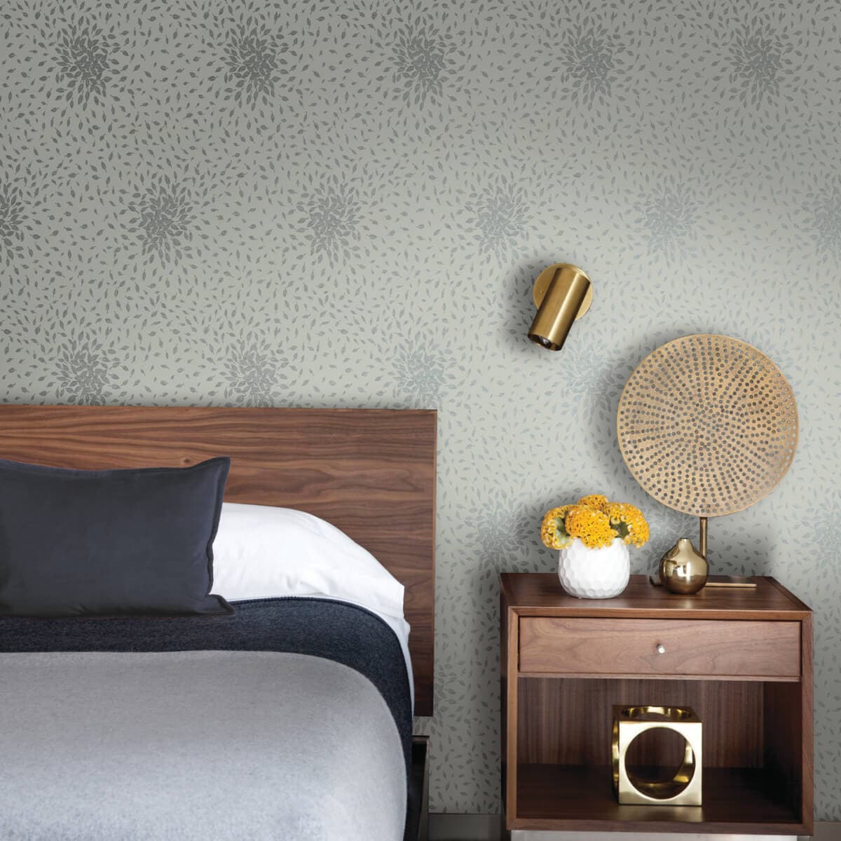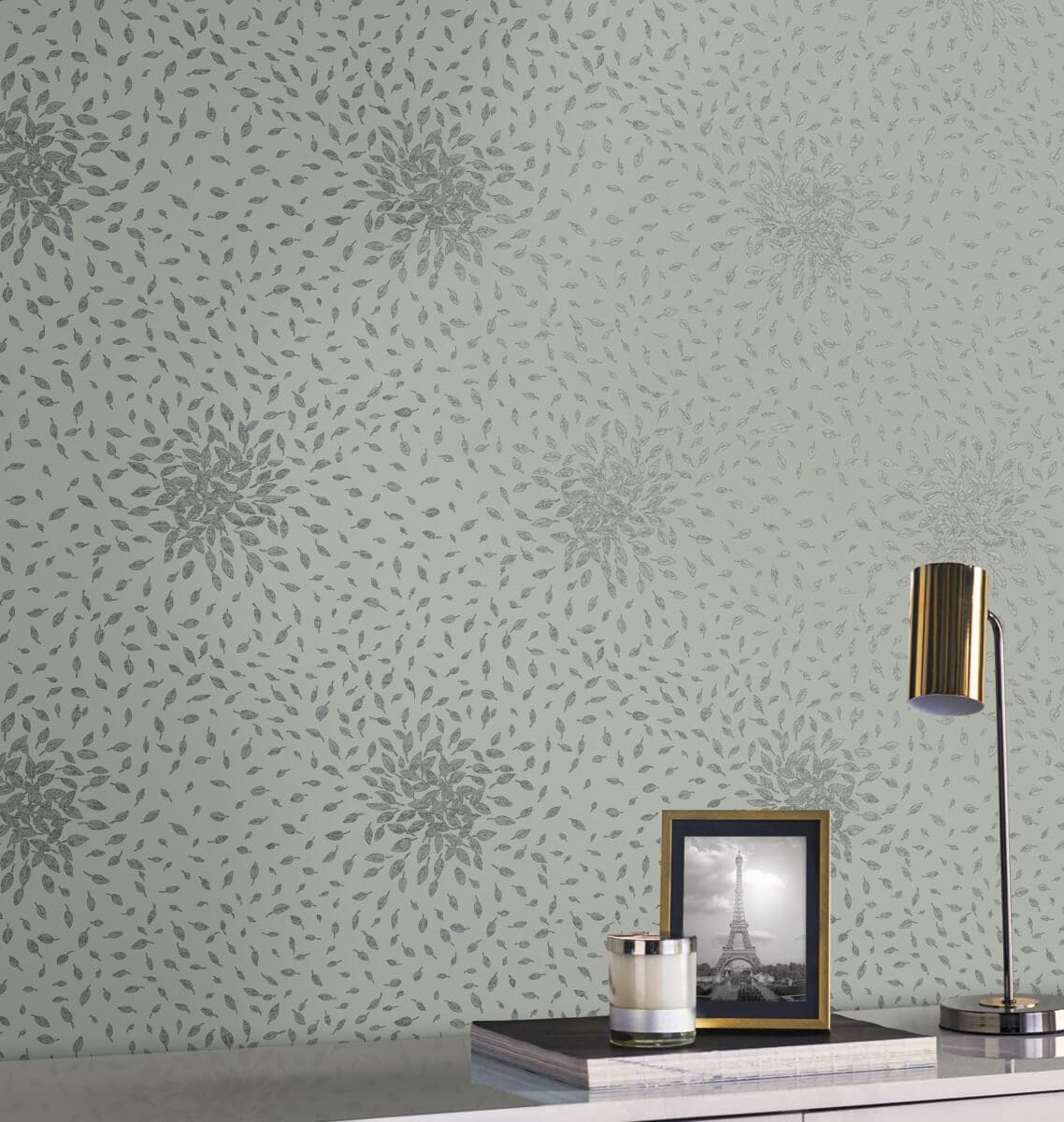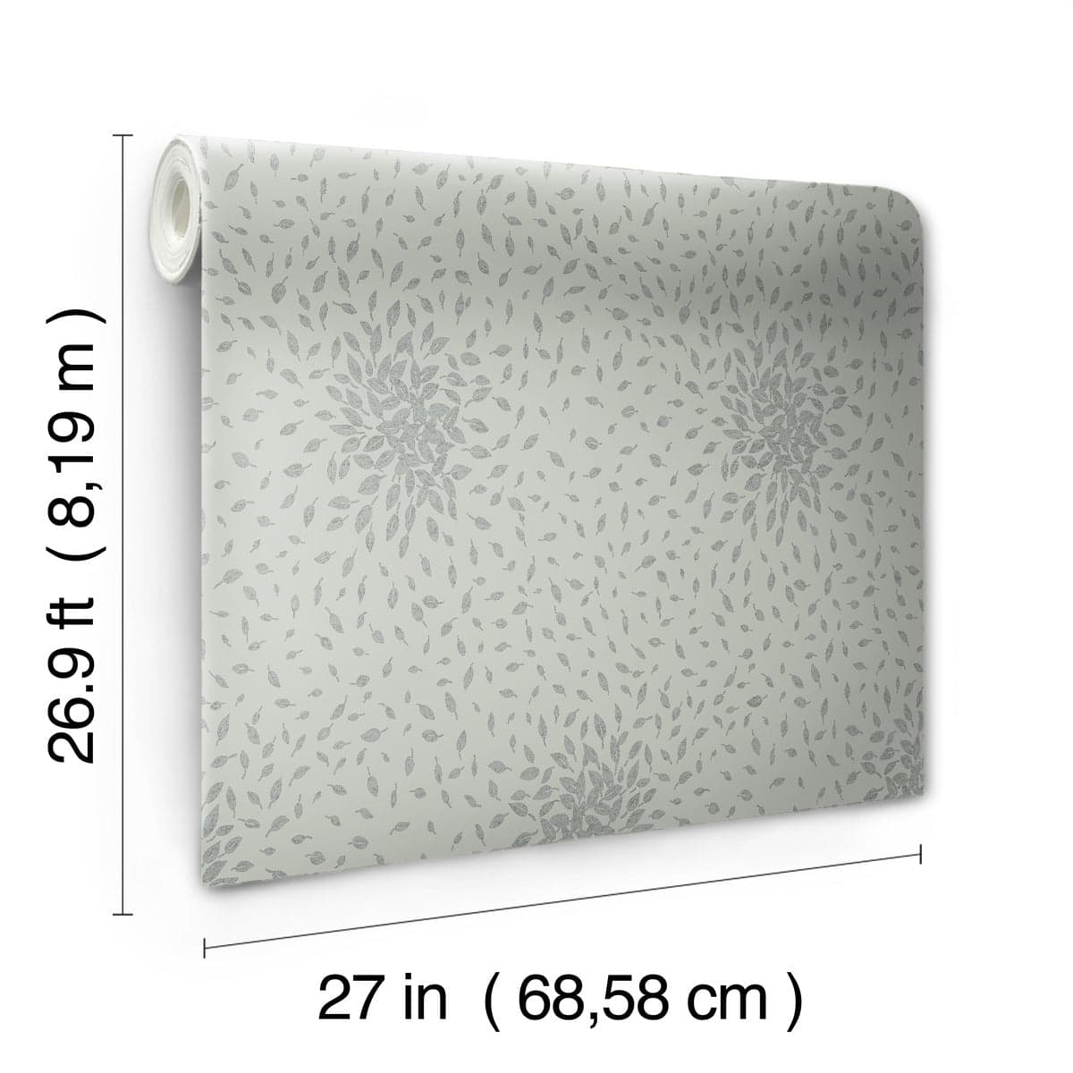 A bluster and flurry of metallic shapes are created by the swirling silhouette pattern of Petite Leaves, shown in eucalyptus green and silver metallic.The long awaited follow-up to the popular first release, Modern Metals Second Edition energizes contemporary spaces with charismatic visual artistry defined by the allure of luminous metallic. Material: Foil on Non Woven Features: Unpasted