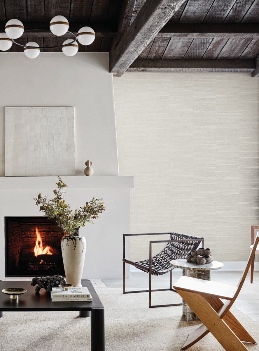 Line Stripe's narrow panels form strips that mimic the look of nature-inspired horizontal grasscloths’ organic fibers, shown in putty gray on white.From the New Origins Collection: The modern aesthetic of natural form.These nature-inspired patterns bring fluidity and the beauty of inherent irregularities to the foreground of the new geometric style. Organic shape and motion become a gallery of sculptural geometry when refined to a core simplicity of line and texture. Material: Non-woven Features: Unpasted