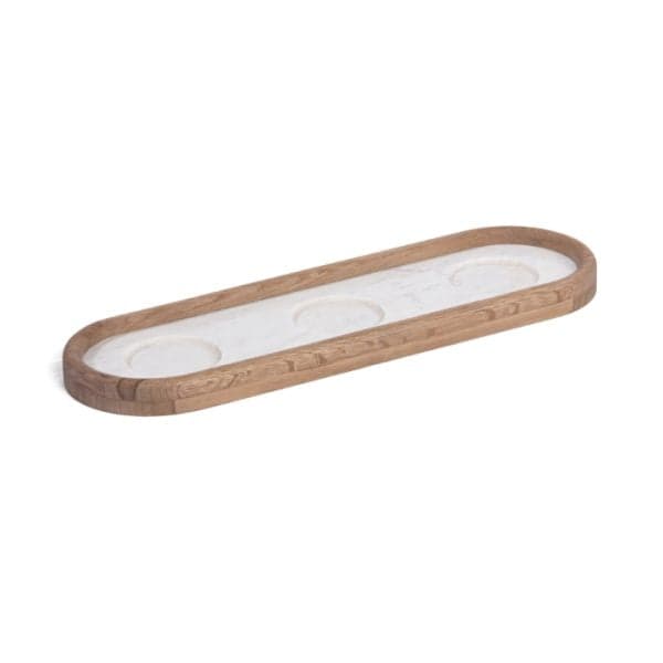 The Ceylon candle holder combines soft modern detailing with warm, contrasting materials. Solid FSC-certified Oak with a profiled edge frames a solid marble tray with carved recesses, perfect for displaying your favorite candles.Product Overview Available Finishes: Charcoal Natural Dimensions: 19.3"W x 6"D x 1.3"H Material: FSC Certified Oak Wood, Marble Weight: 5.8 lb