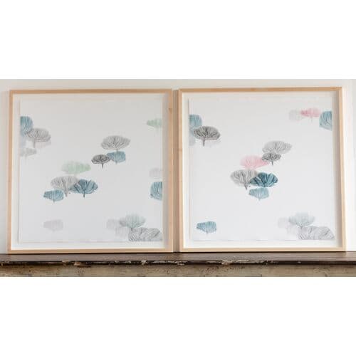 This giclée print features a serene composition, depicting items that resemble either trees or mushrooms. Printed on heavy cotton rag paper, it arrives framed and ready for display.