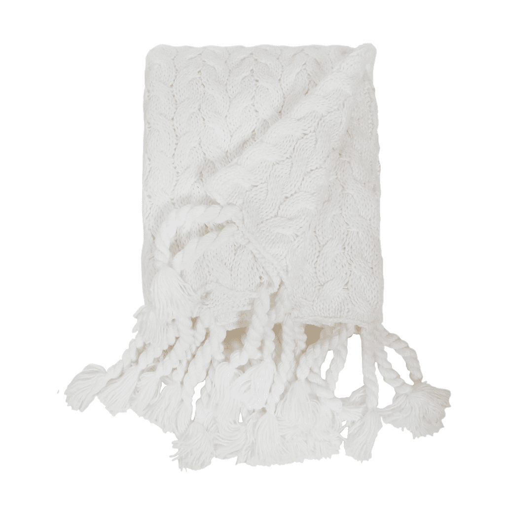 A soft cable knit throw featuring our popular long twisted tassels along the edge. Available in 3 gentle colors.Product Overview Available Colors: Blush Taupe Winter Taupe Dimensions: 50"W x 60"L Material: Acrylic