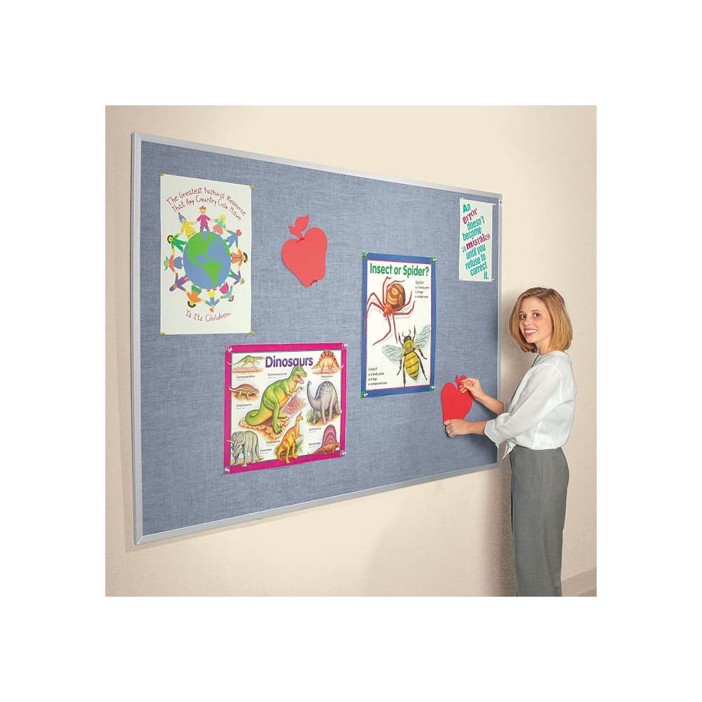 The 6' wide x 4' high bulletin board has a durable canvas-style vinyl surface laminated to natural cork. The vinyl resists crayon, glue, and dust, and can be easily cleaned with detergent and water. It features an aluminum frame. With 11 color options available, there is a suitable choice for your classroom, hallway, or office. The board comes with a 35-year guarantee and includes loop hangers for easy installation.