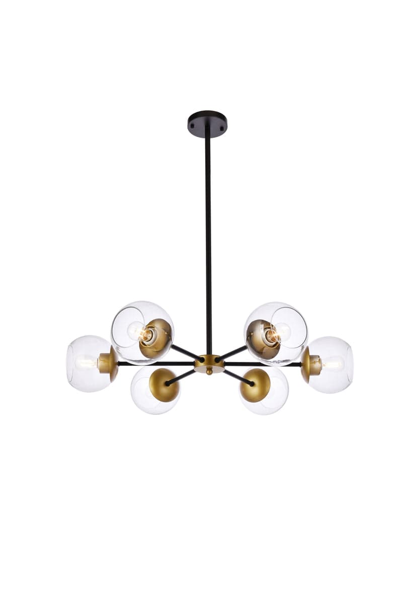 The Briggs collection pendant illuminates in all directions, creating a wonderful display of artistic style and brilliance. If your home was a modern art exhibit, then you have curated the best possible piece of art. With six lights pointing in different directions, and the painted finish gleaming in modern beauty, you won't have to worry about being "up to date" because you already are (light bulbs not included). This modern light fixture is adorned with spherical glass globes. The hardware finish brings an element of sophistication that can accentuate all styles of interior design.Product Overview Available Finishes: Black Black And Brass Brass Dimensions: 30"L x 30"W x 6"H 36"L x 36"W x 6"H Material: Iron, Glass Location Rating: Dry Weight: 7.5 lb Specifications Hardware: Black Iron Light Direction: Any Direction Adjustable Height: Yes Min/Max Height: 10.8"