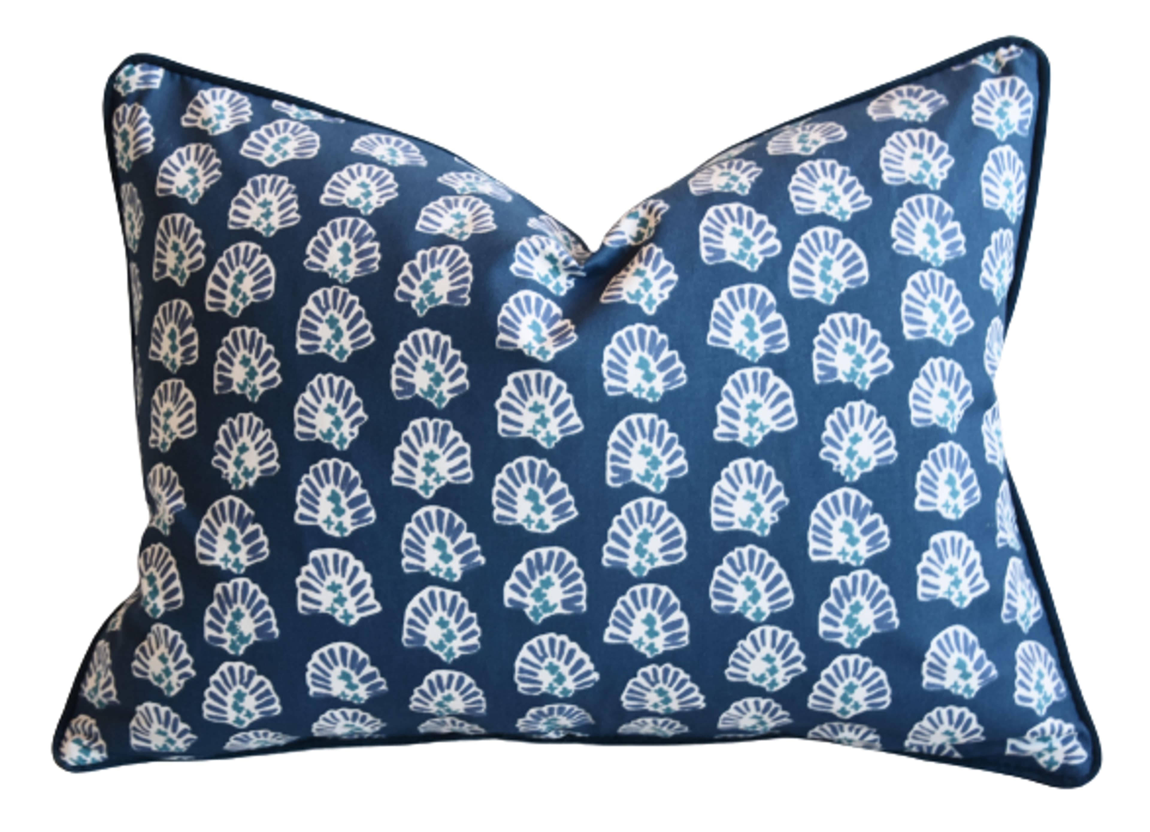 This custom-tailored pillow uses Robert Allen's 'Kola Stencile Lapis' cotton fabric with a coastal nautical theme. It features a blue cotton-velvet back and blue cotton cord trim. A zipper closure and a plump goose down-and-feather insert are included. It is in excellent, unused condition.