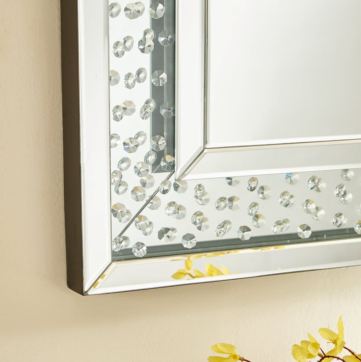The Sparkle collection has crystal gems all over inside , crystals and silver mirror reflect shine. It combine both the function and decoration to set your house. Make a striking statement in your home or office with this stunning contempo style clear mirror. Featuring dozens of expertly cut, beveled edge mirror pieces, layered together to create a bold, yet elegant textured look, you can adorn any prominent wall with this dazzling contemporary mirror and be sure to catch people’s attention. · Contempo rectangular sunburst style clear mirror · Mirrors and all surrounding panels are made with beveled edgesProduct Overview Finish: Clear Dimensions: 24"L x 2"W x 35.5"H 31"L x 1.5"W x 47"H Material: MDF Weight: 33.66 lb Specifications Hanging Orientation: Horizontal Or Vertical Mounting: D Ring Hanging Brackets: 4 Beveled Glass: Yes