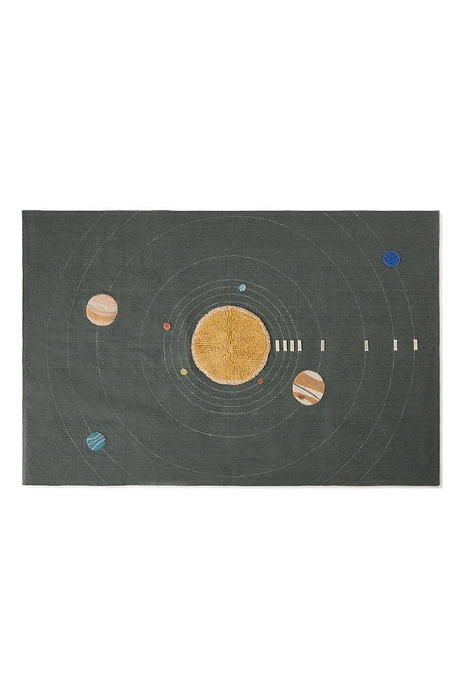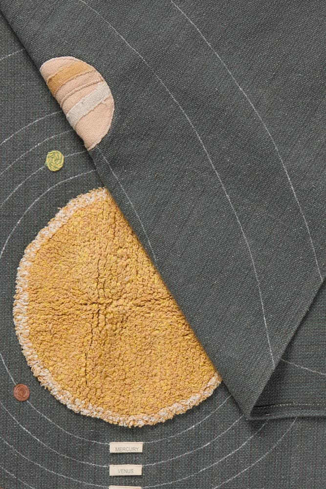 Earth is just a dot in the Solar System! Explore space and feel like a scientist with the Solar System Wall Hanger! From orbits to the sun and the planets orbiting it, this carefully handcrafted wall hanger with a rectangular base in dark grey canvas, featuring a tufted yellow sun at its center surrounded by stitched orbits and planets. The wall hanger includes a printed label detailing the names of the planets, adding an educational touch to its stylish and decorative designProduct Overview Dimensions: 60"L x 39"H Materials: 97% cotton 3% other fibers