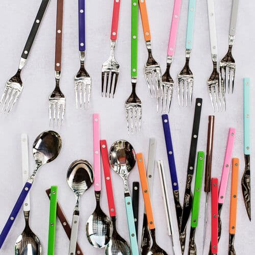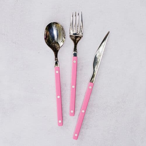 The Pastello Three-Piece Place Setting brings a pop of color to your table. Crafted from durable 18/10 stainless steel, it combines modern, playful style with lasting functionality and is designed to be mixed and matched with other colorful sets in the collection.