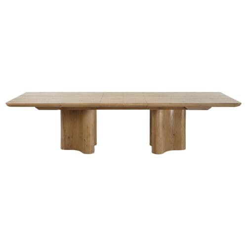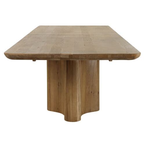 The Anton Dining Table is a masterpiece of bold, sculptural elegance, designed to transform your dining space into a haven of sophistication. Its simple yet striking tabletop is gracefully supported by shapely pedestal legs, exuding a timeless charm. Crafted from solid reclaimed oak, this table is not just a piece of furniture but a testament to nature's beauty and resilience. With the flexibility of two 12-inch leaves, it effortlessly extends to accommodate gatherings of any size, ranging from 96 to 120 inches. The solid wood, with its natural tendency to move with temperature and humidity changes, may develop charming cracks and uneven surfaces over time, enhancing its authenticity and unique character. This dining table is more than a place to share meals; it's a centerpiece for creating cherished memories.