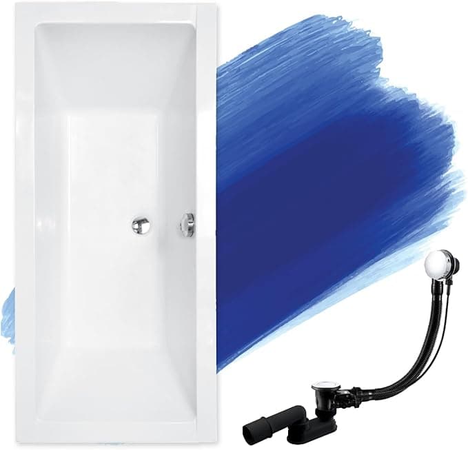 Badland Bath Original White Acrylic Tub Rectangular Quadro Slim 155 x 70 cm Complete Set + Feet and Exclusive Chrome Automatic Drain Fitting Made in EU 3-in-1