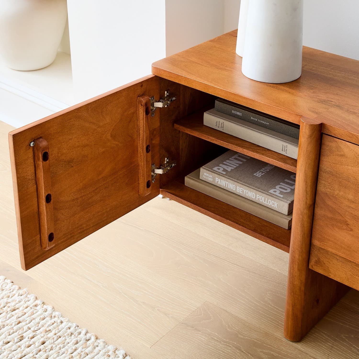Acorn: Kiln-dried solid mango wood frame and legs. The mango wood used on this product is sustainably sourced from trees that no longer produce fruit. Natural variations in wood color and grain make each piece one of a kind. Blonde: Solid mahogany wood frame and legs; white oak veneer over engineered wood top and sides. 3 cabinets with 1 adjustable shelf in each. Acorn console is made in India; Blonde console is made in Indonesia. Condition: Floor model with minor imperfections.