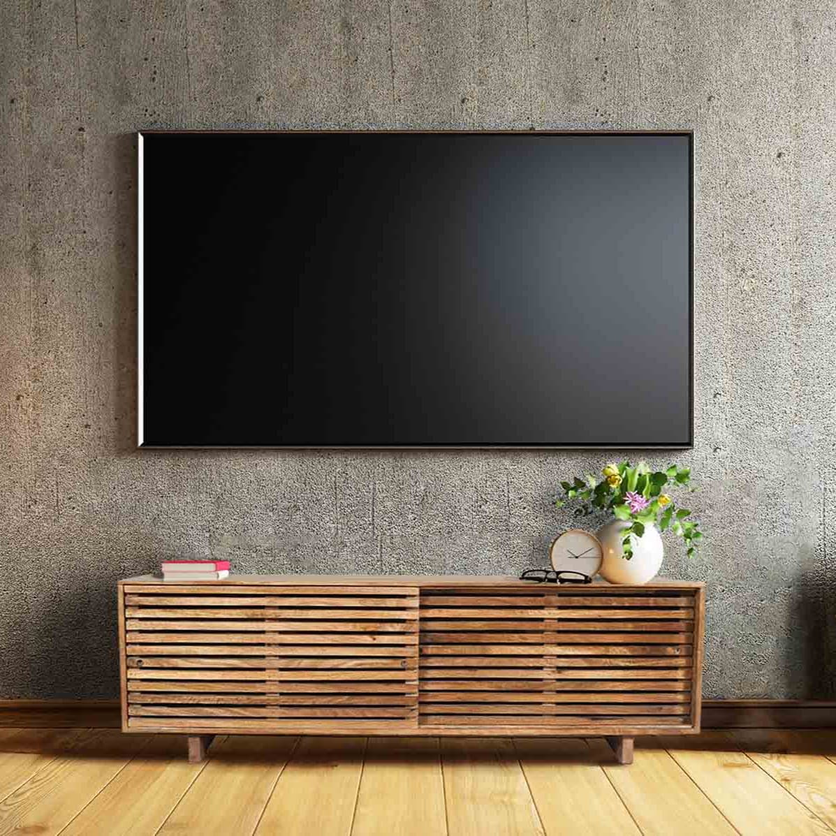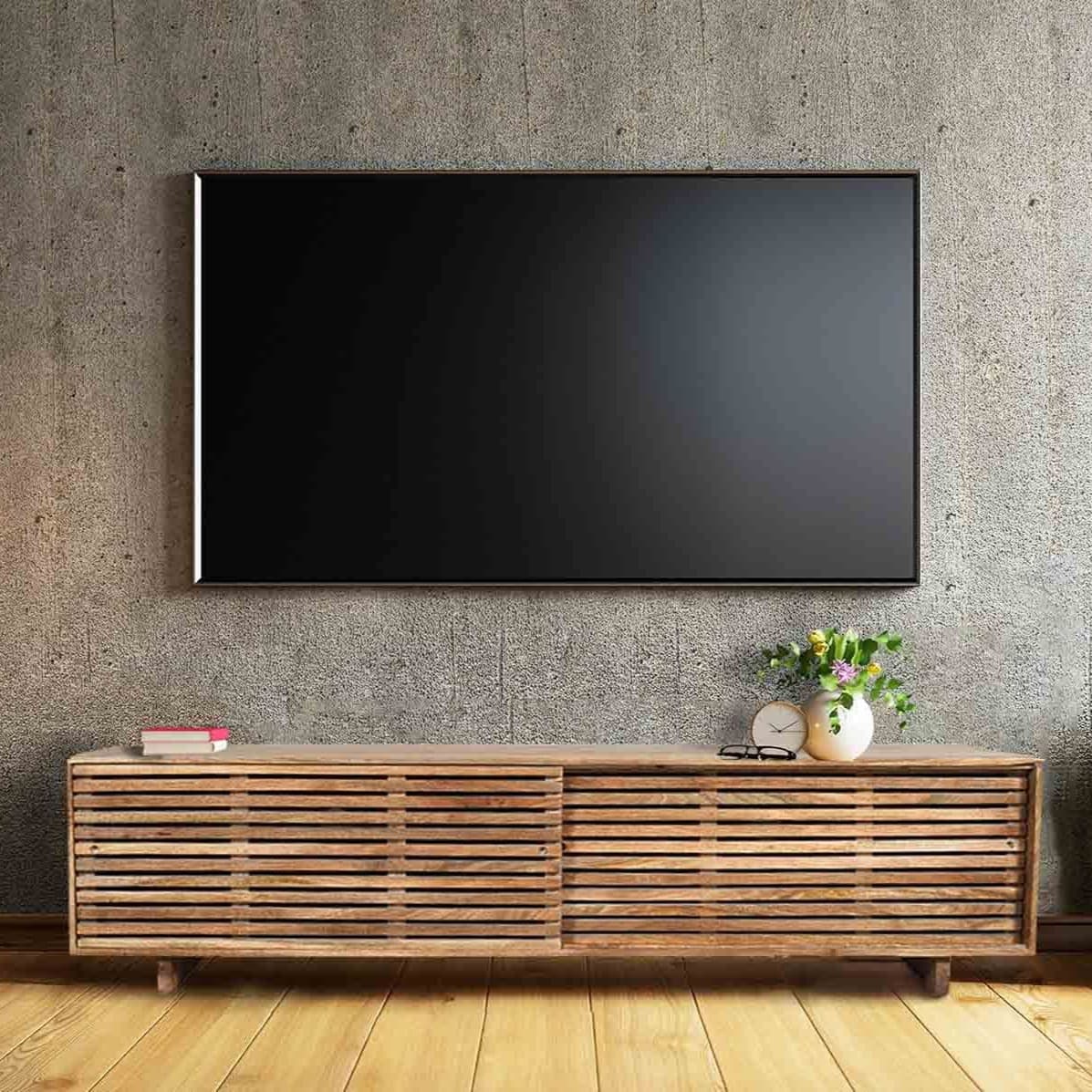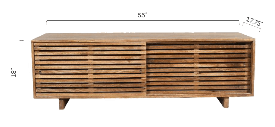 Handcrafted in India with sustainably sourced wood, the Terra Media Console showcases a timeless modern design with sliding doors. Use it under your TV or as extra storage in your home; it blends contemporary style and functionality and comes fully assembled (just attach the legs). Console 55" fits a 55" TV; Console 71" fits a 65–75" TV. Materials: solid mango wood and engineered wood. Note: natural variations in grain and color are expected.