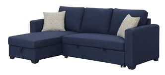 The Pensole Reversible Pop-Up Sleeper Sectional by Emerald Home is a contemporary 3-seat sectional that converts to a sleeper using a pop-up mechanism. Features easy assembly, low-maintenance materials, and a reversible chaise. Color options typically include Blue and Dark Gray.