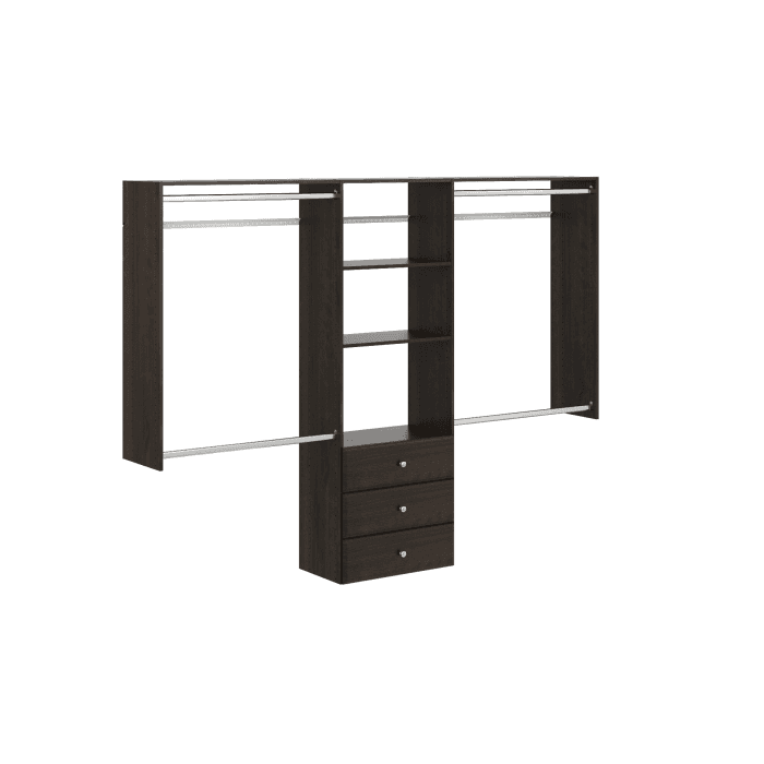 Wall-mounted Easy Track closet kit in Truffle finish with three 8-inch drawers, adjustable shelves and hanging rods. Fits 4–8 ft wide closets, provides up to ~14 ft of shelf space and ~14 ft of hanging space, and installs on a steel rail with included hardware.