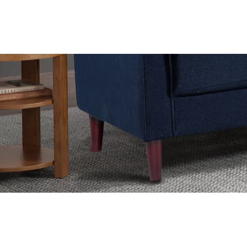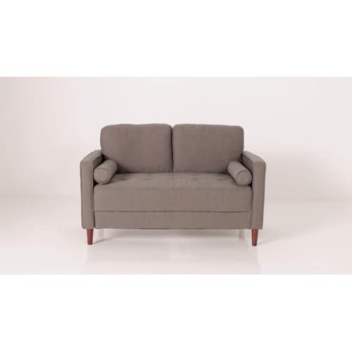 A compact, mid-century-inspired loveseat with square arms and a tufted single-seat cushion. Upholstered in soft polyester on a solid wood frame with espresso-finished tapered legs, it includes two bolster pillows. Removable seat and back cushions for easier upkeep.