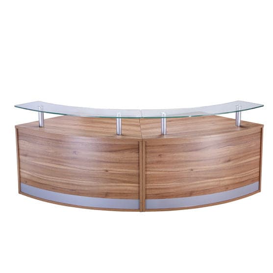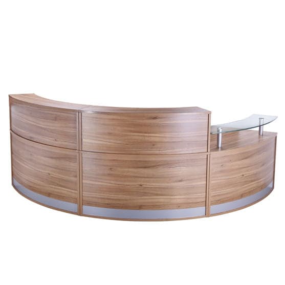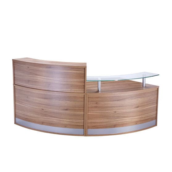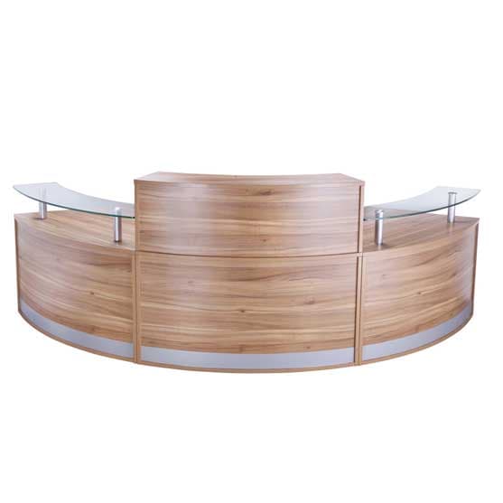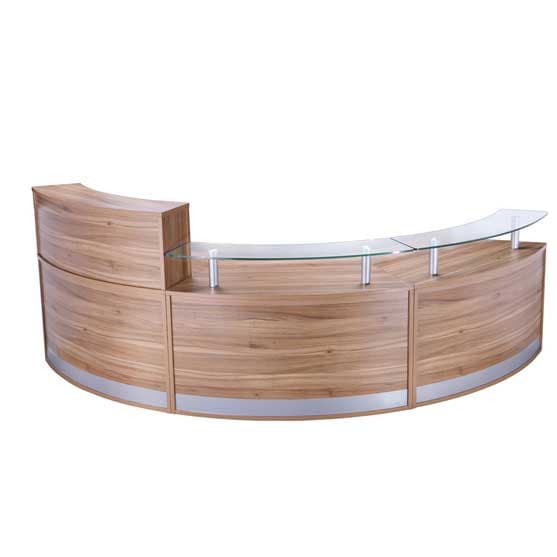 Entry-level curved reception counter available as single, double, triple or four-section configurations. One section measures approximately 1339 W x 872 D x 730–1160 H (mm). Includes top unit or glass shelf, silver kickplate, and finishes in American Black Walnut, Anthracite, Crown Cut Oak, or White. Alternative sizes/shapes and matching storage available.