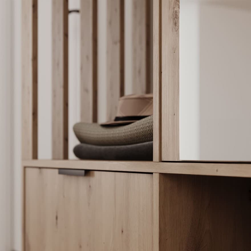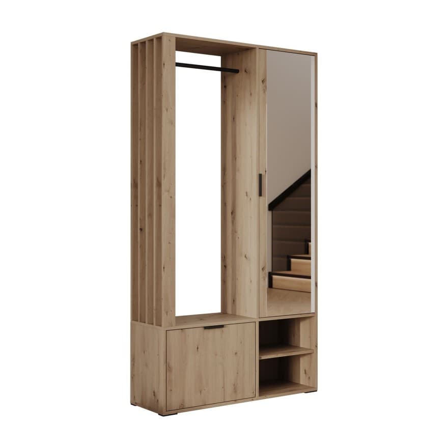 Modern hallway wardrobe with mirror, hanging rail, and shoe storage. Made from high-quality, scratch-resistant laminated board with PVC edging; available in Artisan Oak or Black/Artisan Oak combination. Includes metal handles and clothes rail; decorative slats can be mounted on either side. Delivered flat-pack with hardware and assembly instructions.