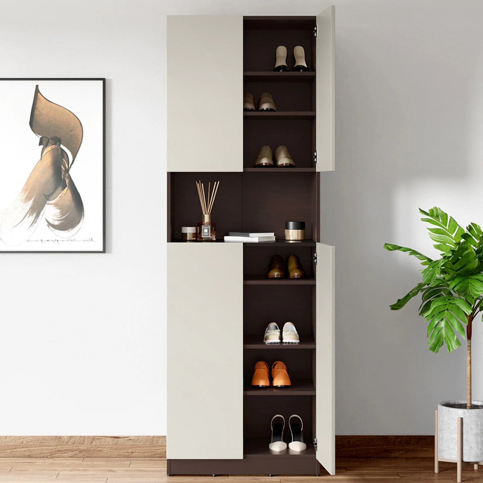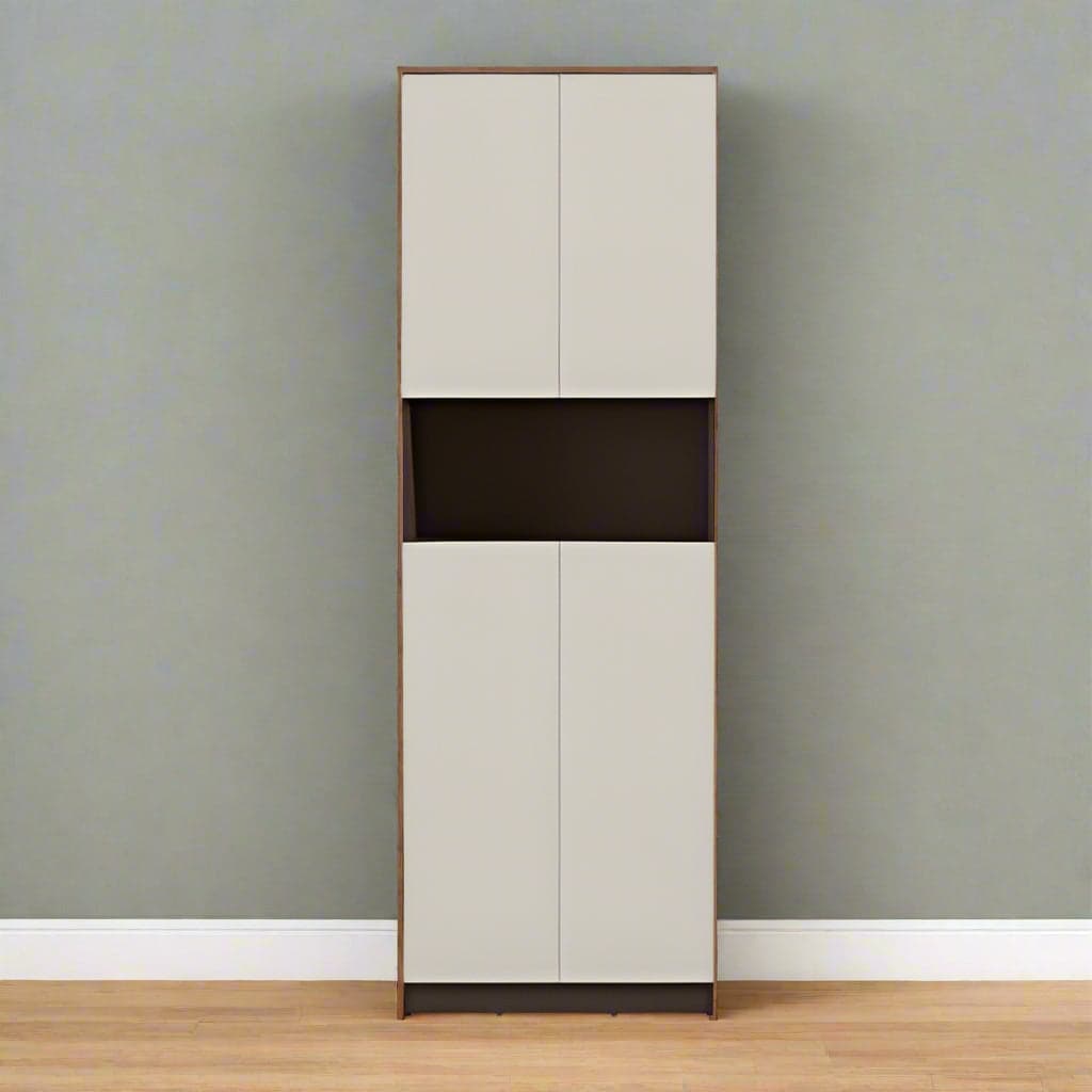 Tall, closed shoe cabinet in laminated engineered wood (16.5 mm) with a modern, minimalist look. Features a quick‑access open shelf, upper parcel/isolation storage, and interior shelves designed to hold up to 16 pairs of footwear.