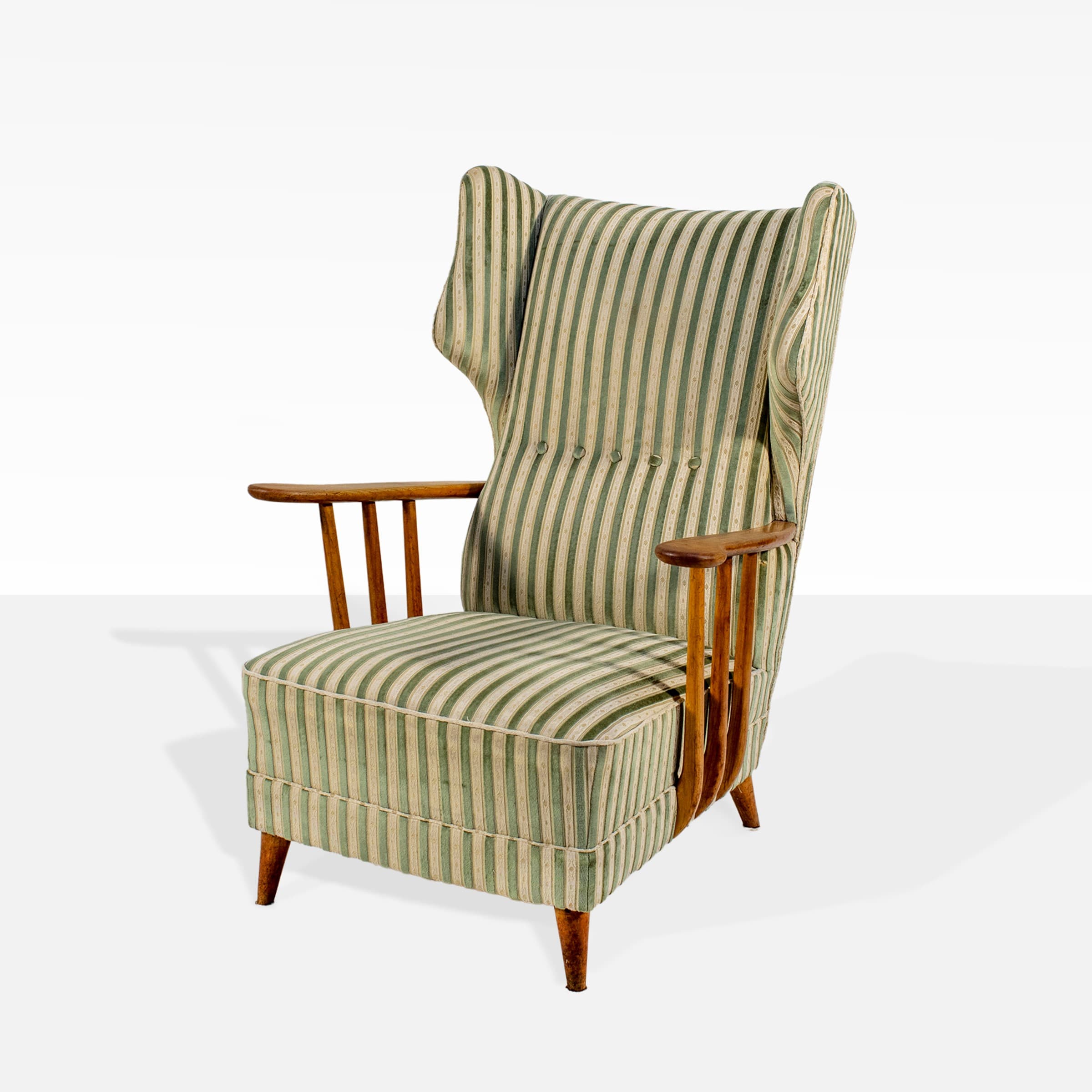 Bergère armchair in wood and upholstered fabric. Literature: Ico Parisi, Catalogo Ragionato, 1936-1960, Roberta Lietti, Silvana Editoriale, pag. 240.