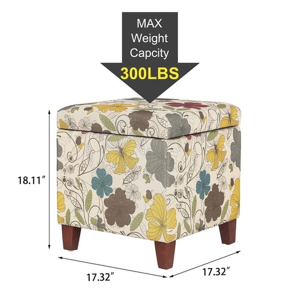 Add a chic and stylish touch to any room with this Adeco Floral Printed Linen Cube Storage Ottoman Footrest Footstool. It features a perfect square shape and thick upholstery padding on top for maximum comfort. The ottoman is designed with hidden storage that allows you to organize small household items, extra pillows, blankets, and books. Cherry finish legs and simple linen fabric add a modern touch; safety-hinged lid, sturdy construction, and light assembly required.