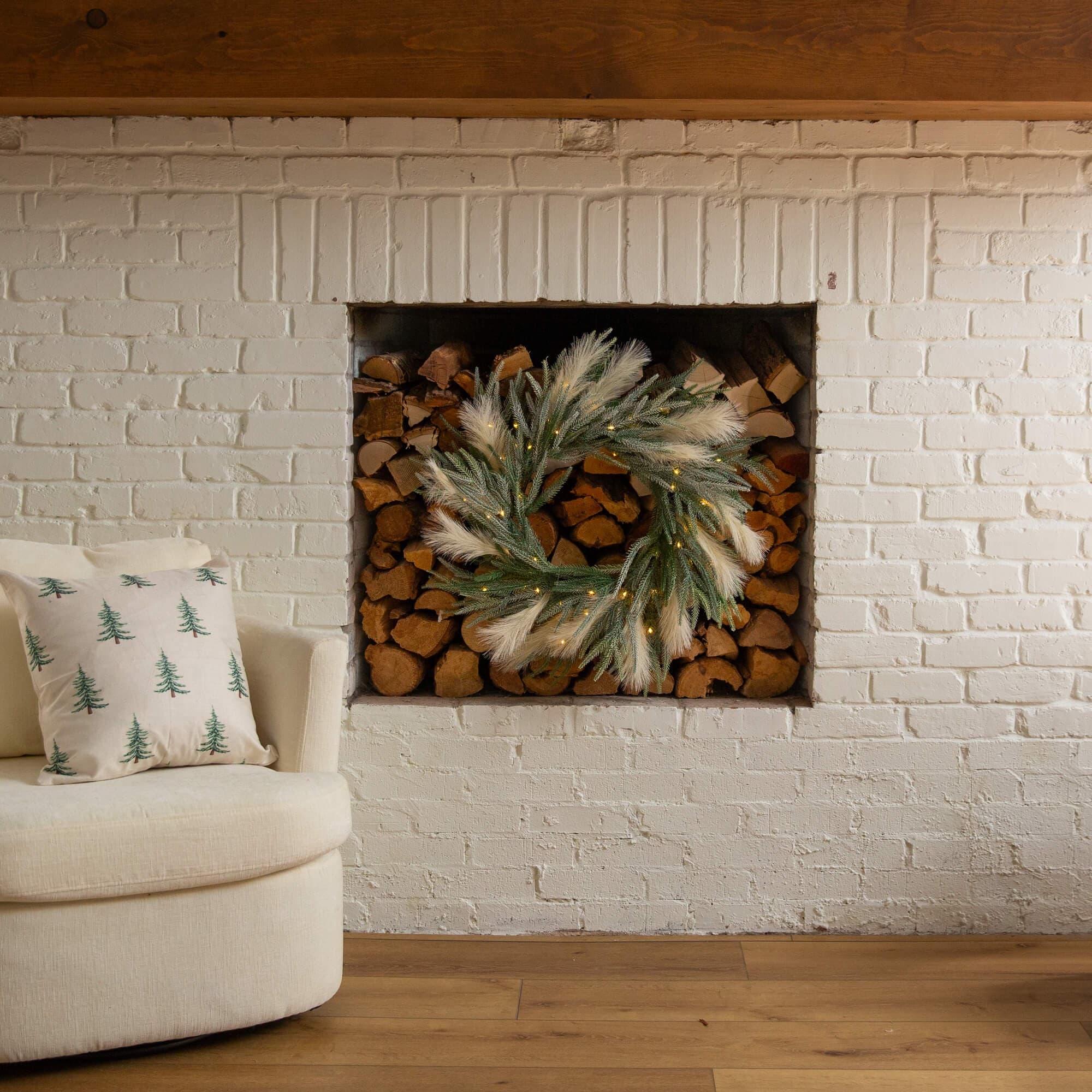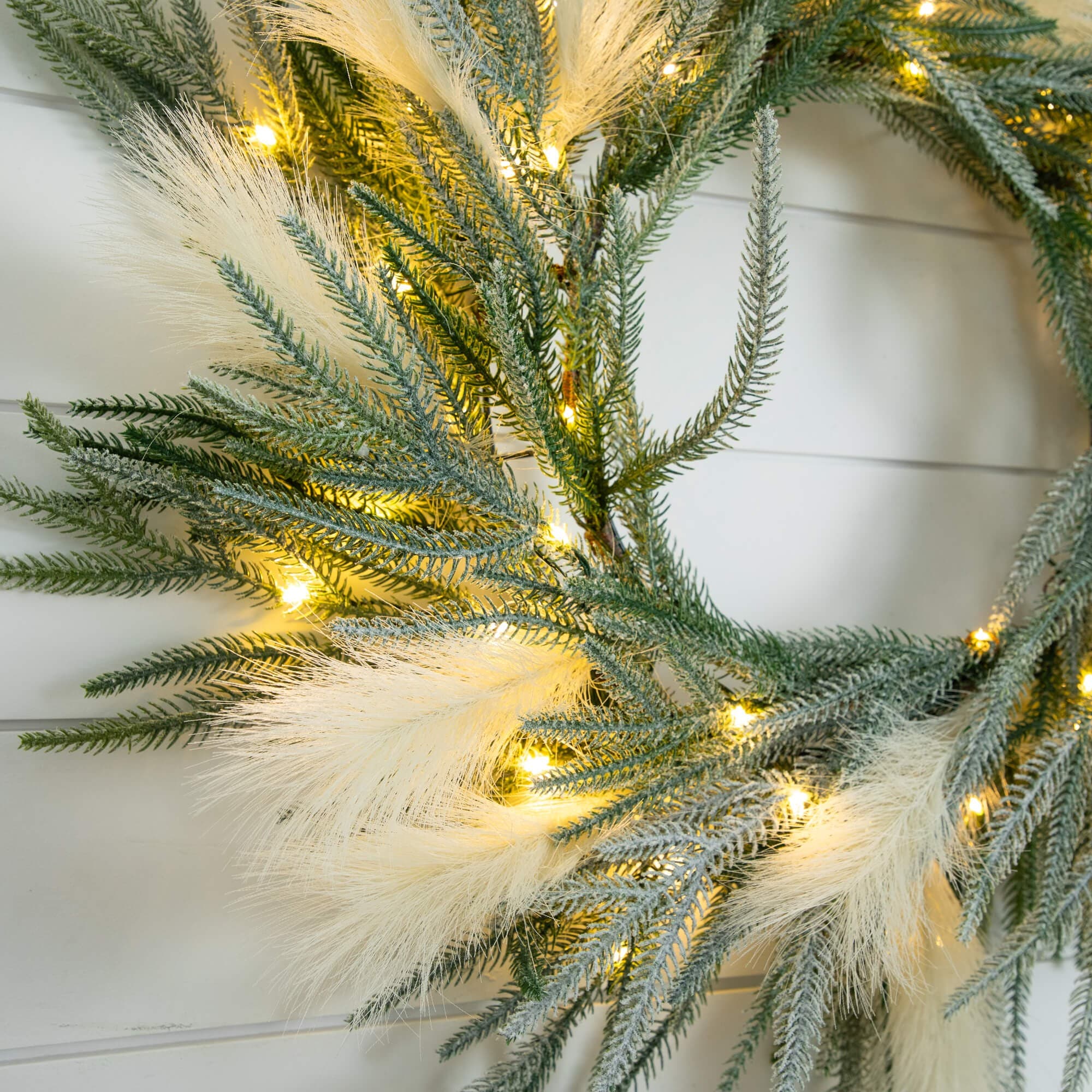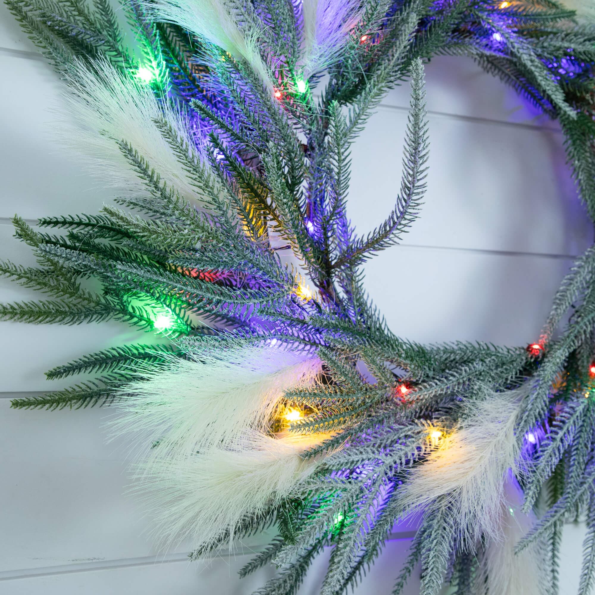 Add a playful twist to holiday traditions with this artificial balsam fir pampas wreath. This unique design combines realistic fir branches with soft, fluffy pampas grass, all illuminated by 50 multicolor LED lights that create a vibrant, festive glow. This piece offers a fresh take on holiday decor with a trendy foliage that brings warmth and cheer wherever displayed. The multicolored lights add a playful energy. With a diameter of 24-In, hang this no-fuss decoration in any space that needs a holiday refresh. Hang on a neutral wall and watcha as it shines, or display as a centerpiece in a dining table.