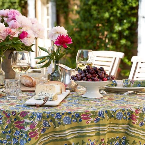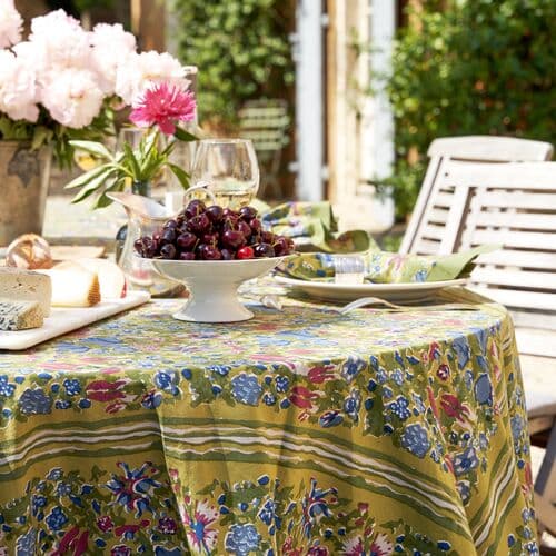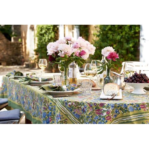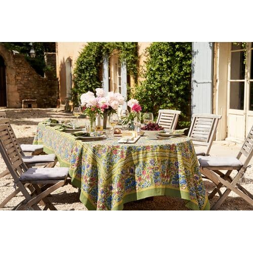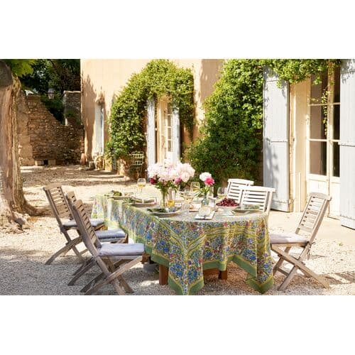 Verdant and lush, the Jardin collection is inspired by the luxuriant, loosely tended gardens of Southern France. The vibrant watercolors of this French linen will enliven any room or outdoor table with a sense of understated beauty and style, whether in spring, summer, or beyond. This tablecloth — available in round, square, and rectangle shapes — has been carefully handprinted by skilled artisans using a time-honored technique, resulting in a singular piece of craftsmanship.