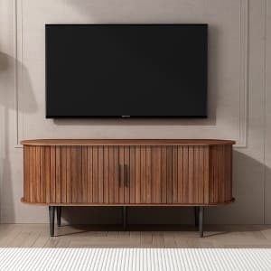 This mid-century modern TV stand blends timeless elegance with practical function, featuring fluted details, a curved silhouette, and a natural wood grain finish that complements any decor. More than just a media console, it doubles as a stylish storage cabinet, ideal for living rooms, bedrooms, or offices. Sliding doors with handles offer quiet, smooth access and flexible display options. Crafted from quality MDF, it ensures strength and stability for long-term use.
