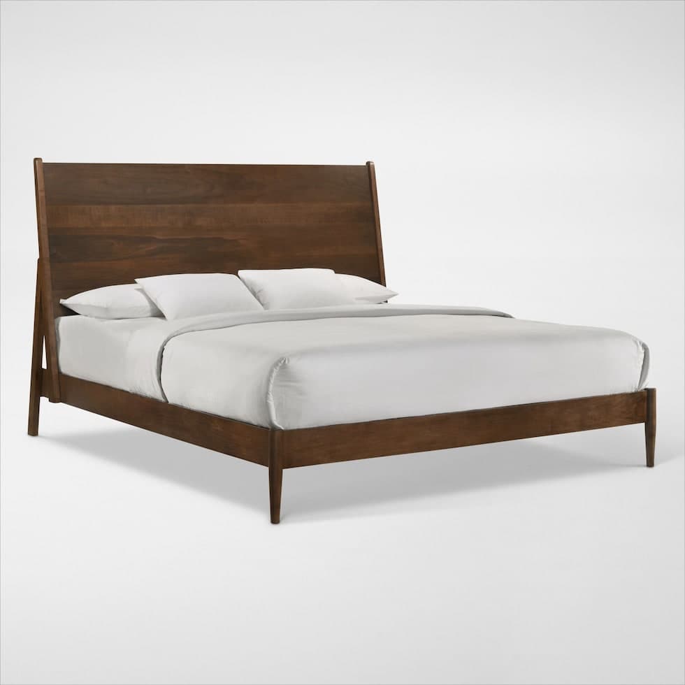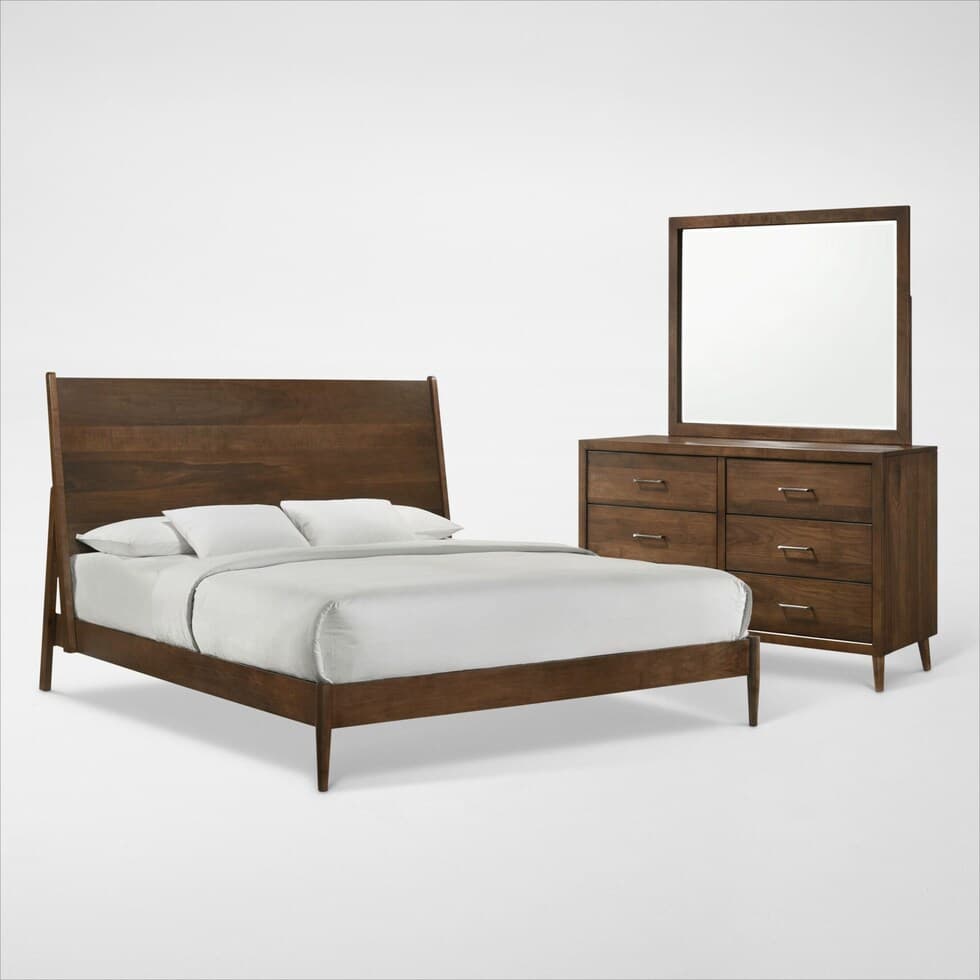 Midtown 5-Piece Panel Bedroom Set with Dresser and Mirror (king). Set includes king headboard, mirror, dresser, rails, footboard and slats. Product page lists wood construction and a light brown finish.