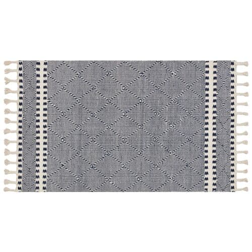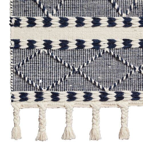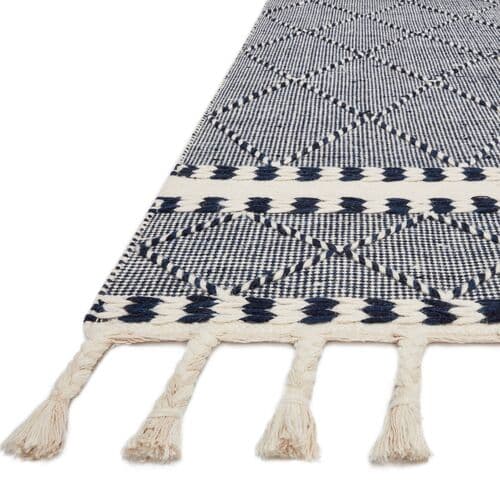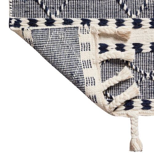 Featuring various weaves and braided fringe, this hand-loomed rug showcases traditional craftsmanship. Its navy-and-white color scheme and geometric patterns make it suitable for both classic and modern spaces. A rug pad is advised to prevent slipping and to prolong the rug's lifespan.