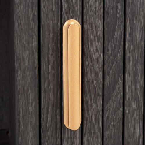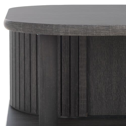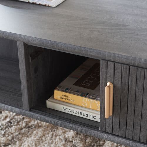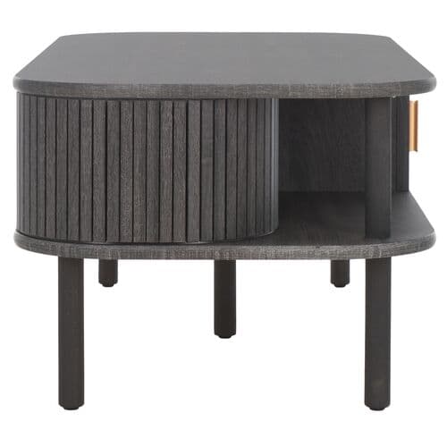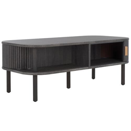 Bring elevated style and functionality to any room with our sleek and modern Lyrican Coffee Table. Its clean-lined profile and sleek rounded edges lend practical elegance and charm to any space. Featuring tambour doors on each side for added style and functionality, the table's cabinets allow you to keep your essentials within easy reach, while open shelves offer ample space for display. The gold pulls of the cabinet create a warm contrast with the table's finish, enhancing its sophisticated appeal.