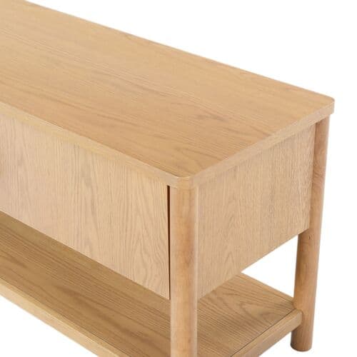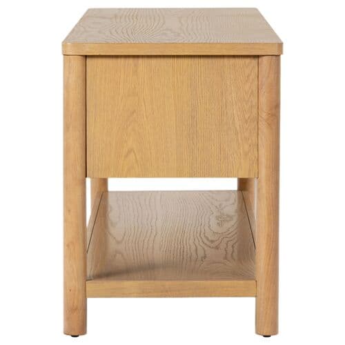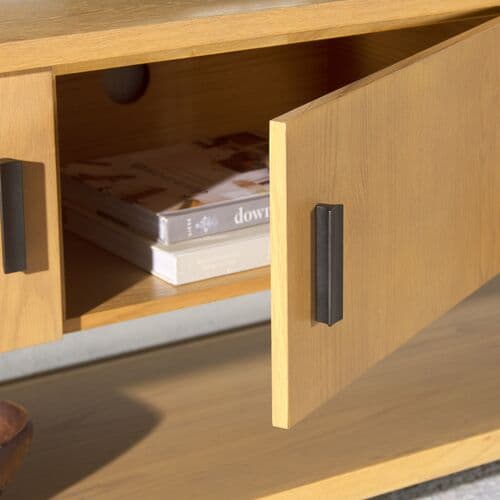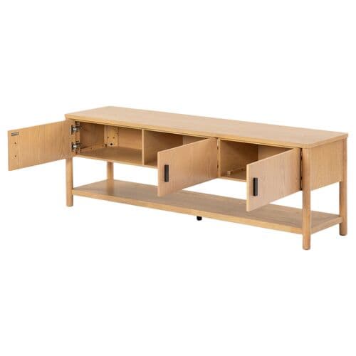 Introducing The Draven 3 Door Sideboard And TV Stand; a unique blend of style and function. This piece beautifully complements any interior decor and adds a touch of elegance to your living space. Crafted from a mix of solid rubber wood, oak veneer, and manufactured wood, it offers unmatched durability and stands strong against regular usage. The use of zinc for its metal elements ensures robust stability while enhancing its overall aesthetic appeal. With a three-door design, this stand offers ample storage space for all your media essentials. The Draven 3 Door Sideboard and TV Stand is not just a piece of furniture, but a statement of your refined taste. Upgrade your entertainment area with this perfect blend of style and durability. Accommodates TVs up to 75 inches.