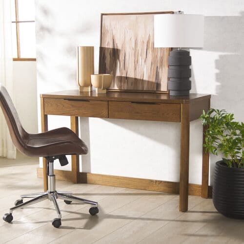 Introducing The Orentta 2 Drawer Wood Desk, a sophisticated fusion of style and functionality. Crafted from a blend of robust materials including rubber wood, oak veneer, plywood, and manufactured wood, this desk is designed for durability and elegance. Its construction is supported by iron metal, adding an industrial touch to its rustic charm. The desk features two spacious drawers, providing ample storage to keep your workspace neat and organized. Each drawer is solid and reliable, ready to safeguard your essential items. Whether you're looking to enhance your home office or commercial space, the Orentta 2 Drawer Wood Desk offers a seamless blend of style and utility, making it an ideal addition to any modern setting.