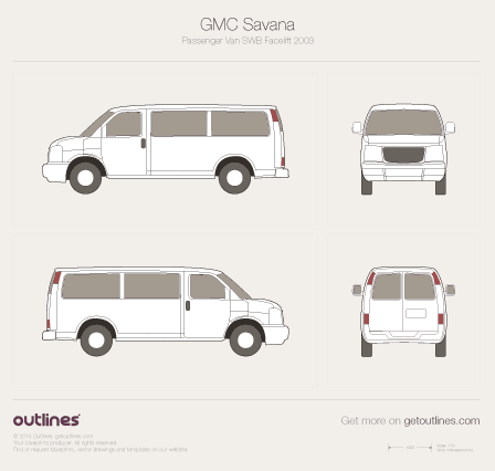 Buy this GMC Savana 3500 Passenger blueprint and line drawing in high quality editable vector file formats. Best for 3d and car wrap design. Views: Front Top Rear Side. License: Basic License. Scale: 1:10. Units: mm | ft. Formats included: AI, EPS, PDF, SVG, DWG, DXF. Note: Outlines blueprints are intended for visual/design use and are not exact engineering drawings.
