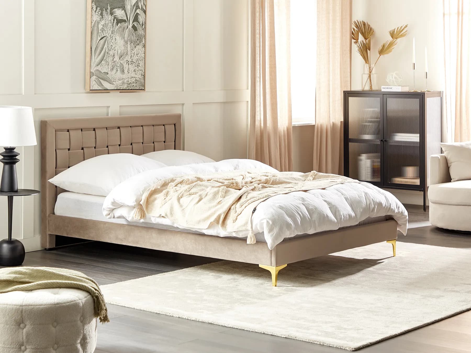 Glam upholstered bed frame upholstered in quality velvet (taupe). Features sprung slatted base (28 slats), chic headboard for comfortable reading, sturdy plywood/pine construction, weight capacity 220 kg. Mattress and bedding not included.