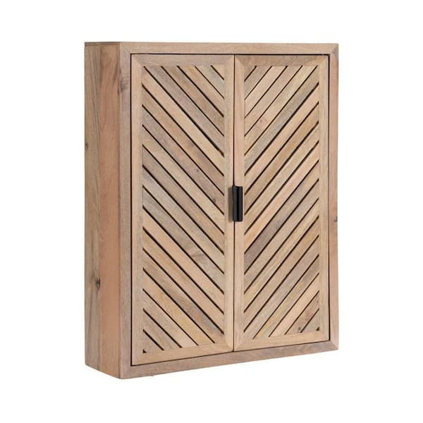 Natural mango wood construction for a unique look. Magnetic clasps keep the doors closed. Metal Z-brackets allow easy hanging.