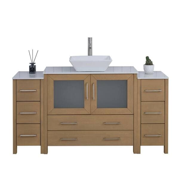 Vanity Art 60 in. W Single Basin Natural Oak Bath Vanity with White Engineered Marble Top and Mirror