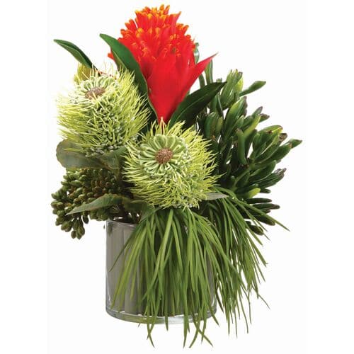 12 Bromeliad and Succulent Arrangement on Glass Vase - Green
