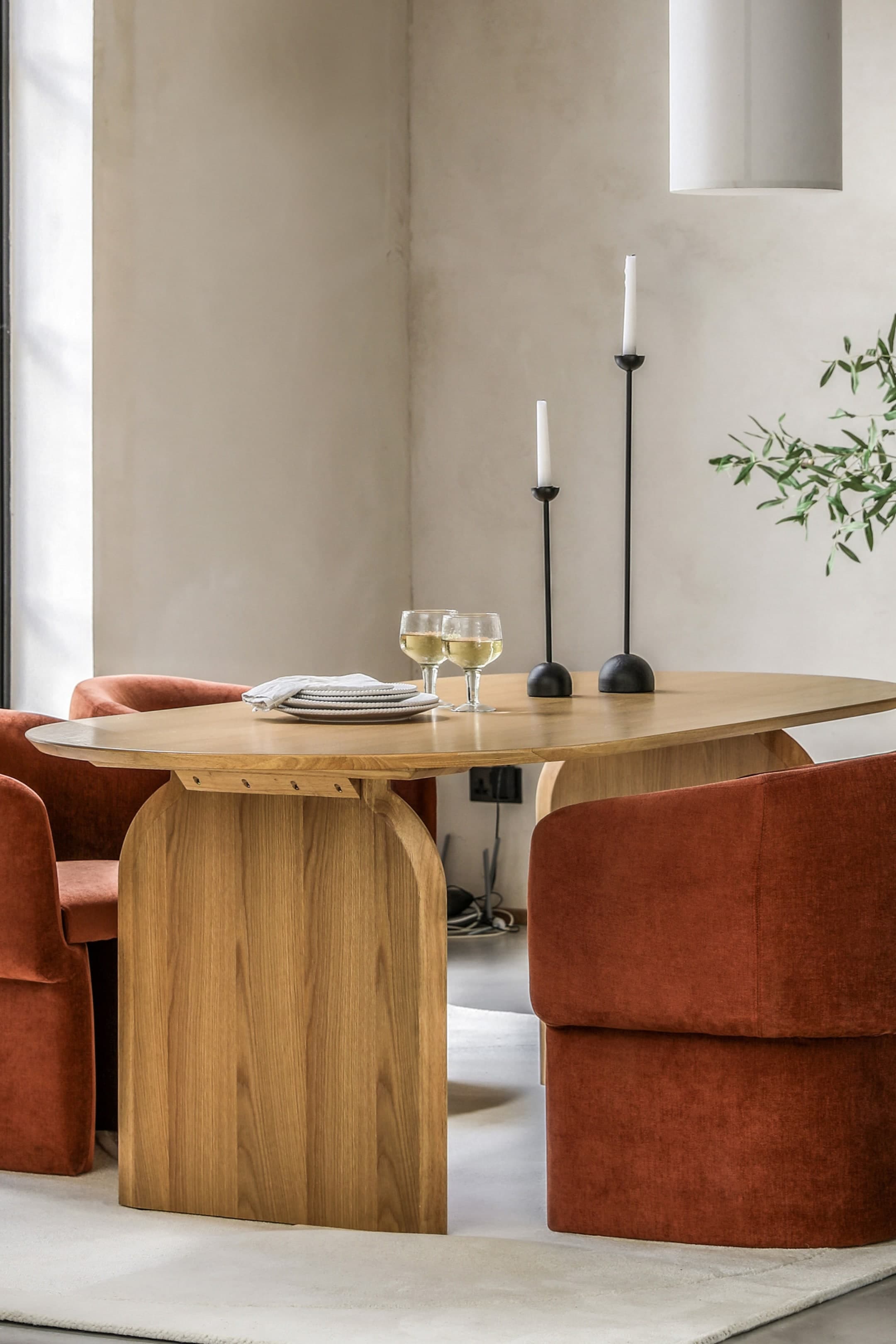 Designed to highlight the use of geometric design, with a nod towards retro style but in a more modern format, this beautiful dining table features a lovely elegant top with curved ends, with this form echoed on the tops of the legs. It is made using oak veneers and solids, where practical, with a natural matt finish.