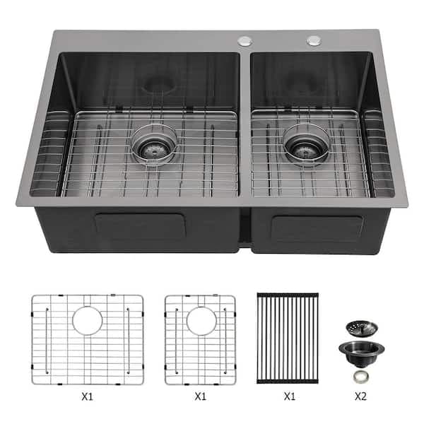 33 in. Drop-in Double Bowl (60/40) 16-Gauge Gunmetal Black Stainless Steel Kitchen Sink with Bottom Grids