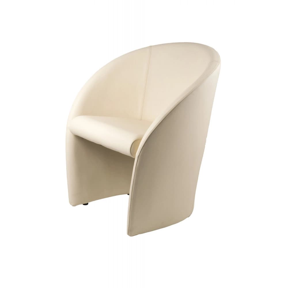 Bürostuhl mit abgerundeter Rückenlehne, bezogen mit cremefarbenem Anilinleder. Ein halbrunder Korpus bildet Rückenlehne und Armlehnen; Metallstruktur aus kaltgeformtem Polyurethanschaum, ruht auf sechs kleinen Gummifüßen. Bezogen mit cremefarbenem Leder. Material: Schaumstoff, Leder.