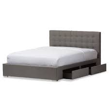 Take control of your storage needs and modernize your bedroom with this Baxton Studio Adonis four-drawer king-size storage platform bed. Complete with two pull-out drawers that are spacious enough for extra pillows, blankets, or clothing, this button-tufted platform bed features a slat-base design that eliminates the need for a box spring. Materials: 100% polyester fabric, MDF, particle board, foam. Color: Grey. Four (4) drawers. Foam-filled. Made in Malaysia. Care: Spot clean only.