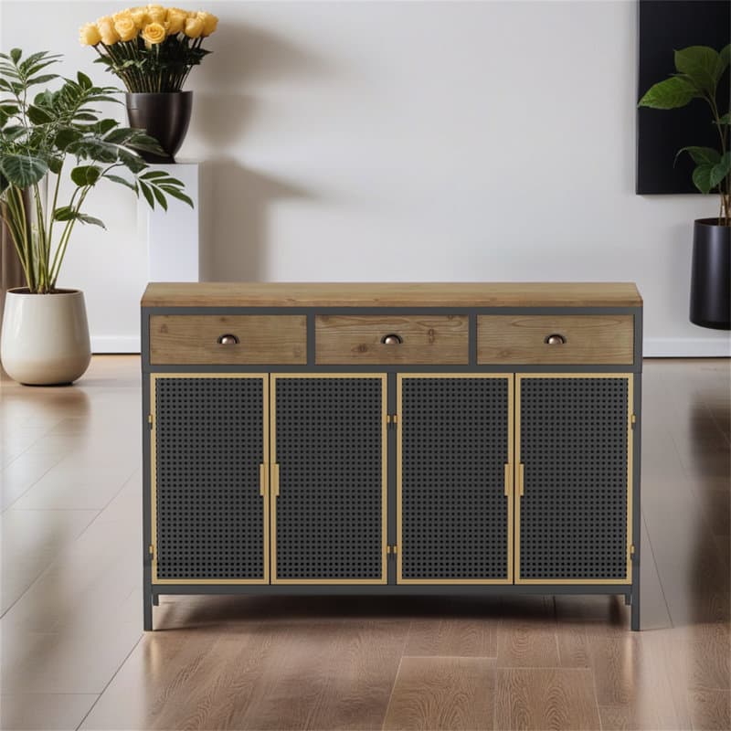 Modern Freestanding Sideboard with Top Drawers, Perfect for Your Daily Storage, Suitable for Home and Office, very Minimalist and High quality. Countertop material: Solid Wood. Color: Black. Includes 3 drawers and 4 doors. Overall product weight: 51.81 lb. Assembly required.